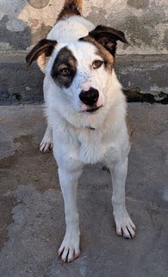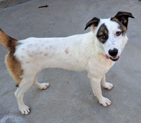 Sie kam im August 2025 zu uns auf die Island of Hope. Sie wurde von einer Frau zu uns ins Tierheim gebracht, nachdem diese sie beim Gasthaus Vlasia beinahe von einem Auto angefahren sah. Sie war mit ihrem Kind unterwegs und wollte nicht wegsehen, als sie Carly sah – sie suchte über Google nach Hilfe und fand unser Tierheim. Bei der Aufnahme wurde kein Mikrochip gefunden, daher haben wir sie bei uns behalten.