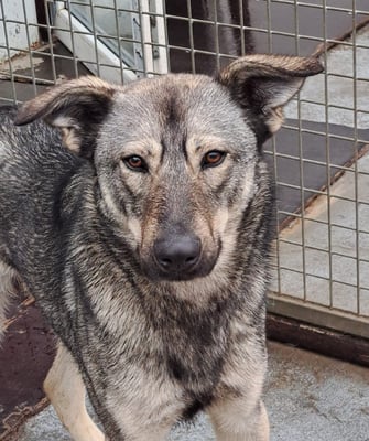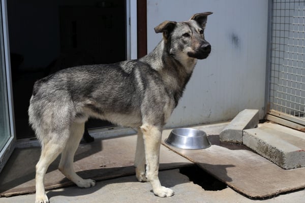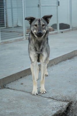 He has a gentle character who initially reacts cautiously and reservedly towards new people, but he does accept food from their hands and sniffs at them. He strongly looks to his braver canine companions for guidance, so having a confident first dog in his new home would be a great help for him. He could orient himself well to this dog and gradually gain confidence.