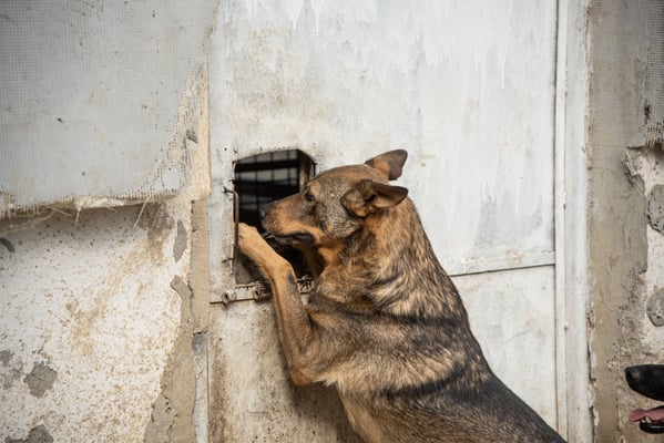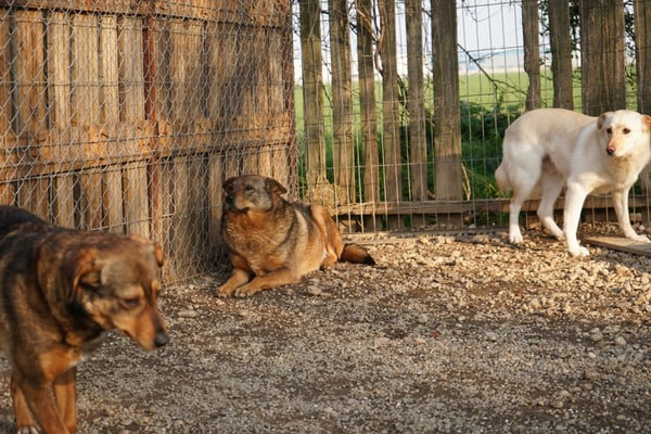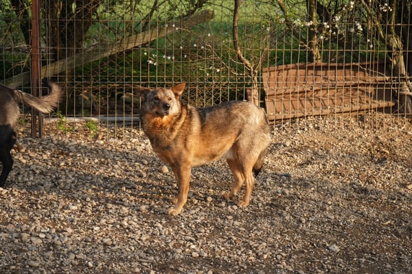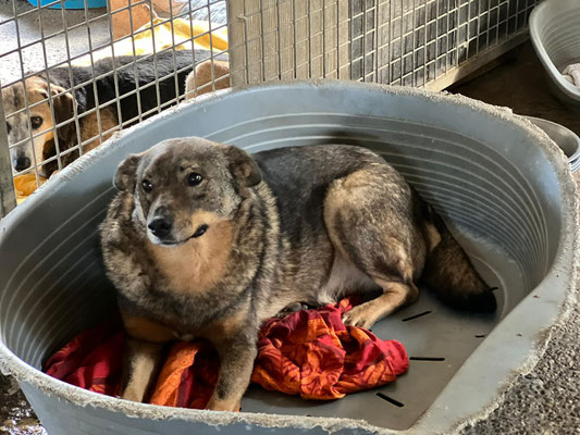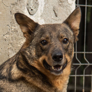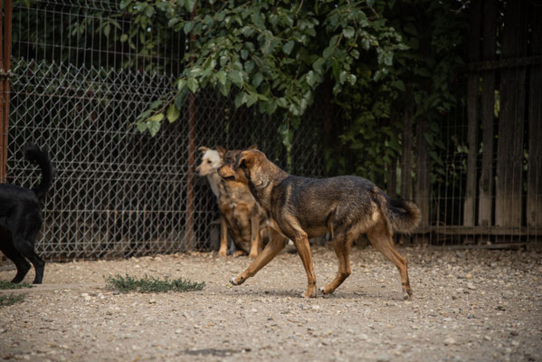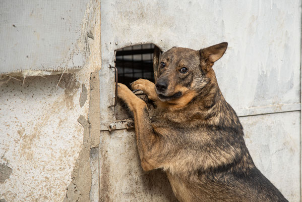 Allerdings ist Dash leider sehr ängstlich, im Freilauf rennt er sofort weg, nah kommt man (v.a. als Unbekannter) nicht an ihn heran. Eine Gruppe Freiwilliger war vor Ort, nach einiger Zeit mit ihnen im Auslauf hat er sich aber immerhin für sie interessiert und hat sie - hinter den anderen Hunden versteckt - beobachtet. Wenn sie aber in sein Gehege gekommen sind versucht er sofort in den angeschlossenen Außenbereich zu flüchten und lässt sich (auch mit Leckerlis) nicht hereinlocken. Wenn man ihm diese Fluchtmöglichkeit nimmt, weil bspw. der Durchgang verschlossen ist, verschwindet er sofort in sein Körbchen in der Ecke. Er ist eher defensiv und weicht zurück, riskiert lieber nichts.