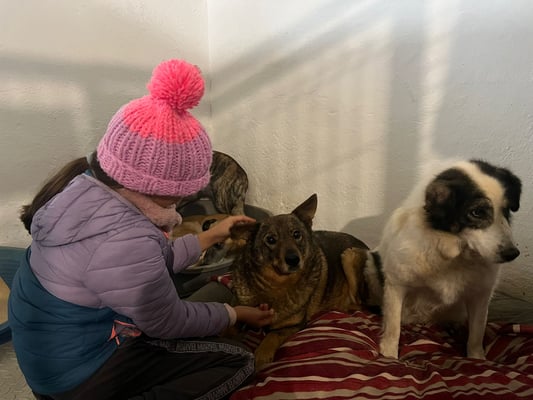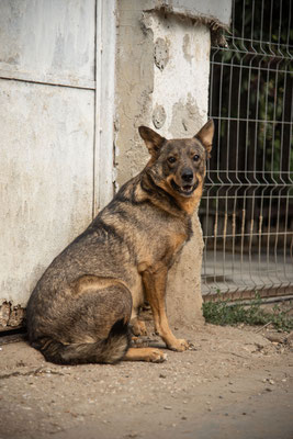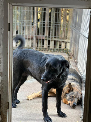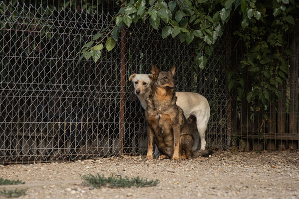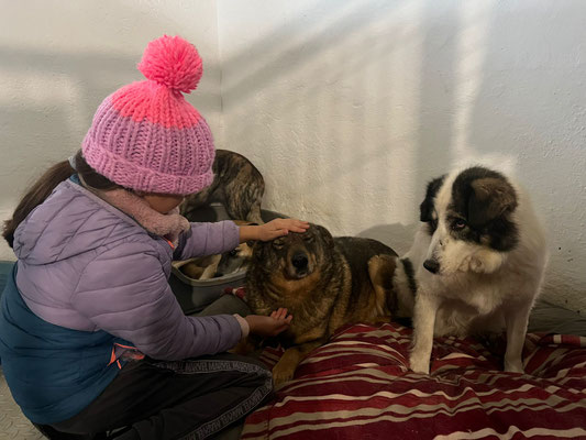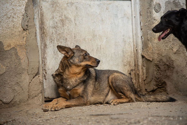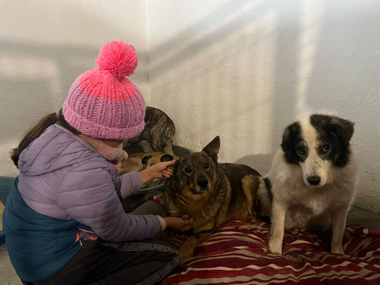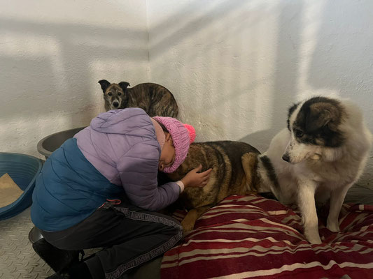 Der Mitarbeiter, der täglich in seiner Halle ist, kann sich ihm aber nähern und auch neben ihn sitzen, ohne dass er flüchtet. Ihn sieht er jeden Tag und er verbringt zwischen den Reinigungsarbeiten und der Versorgung auch immer mal Zeit mit den Hunden, ist ihm also vertrauter.