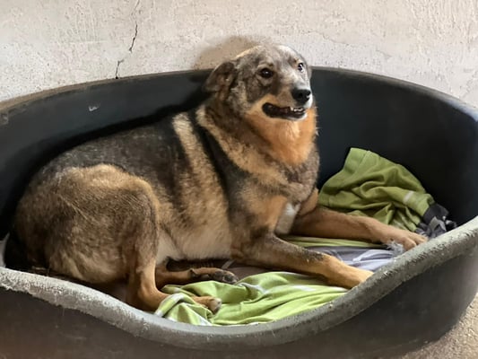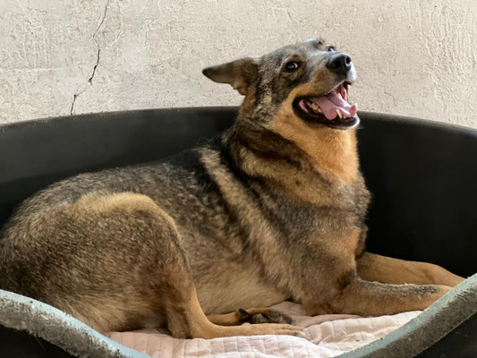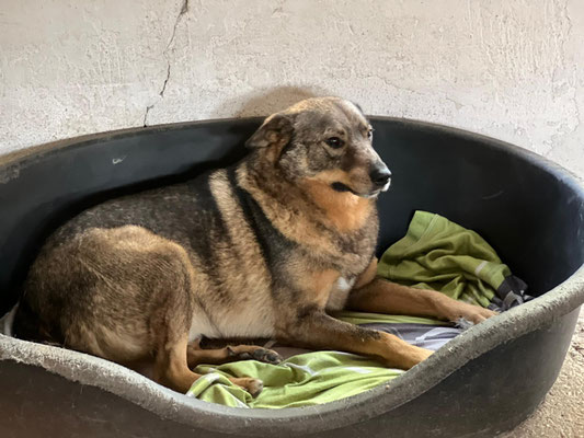 However, Dash is unfortunately very fearful, in the free run he immediately runs away, you can not get close to him (especially as a stranger). A group of volunteers was on site, but after some time with them in the run, he was at least interested in them and watched them - hiding behind the other dogs. However, when they came into his enclosure he immediately tries to escape to the attached outdoor area and cannot be lured in (even with treats). If you take this escape possibility away from him, because e.g. the passage is closed, he immediately disappears into his basket in the corner. He is rather defensive and backs away, preferring not to risk anything.