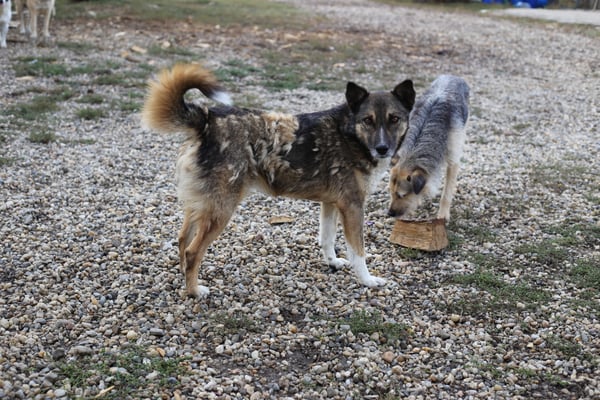 He is socially compatible and friendly with other dogs and lives here with us in a mixed group.