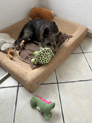 Magdalena loves being outdoors. She already walks well on a leash and enjoys long walks and outings. We are looking for a home for her with a garden or with people who spend a lot of time outdoors. She can already be left alone quite well with the resident dog in her foster home and settles down in restaurants after a while. Children aged 12 and up are welcome in her new home, but should be sturdy and have experience with dogs, as Magdalena sometimes expresses her affection with full physical commitment.