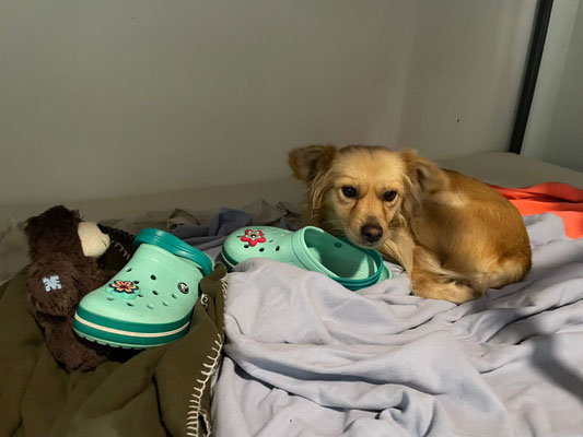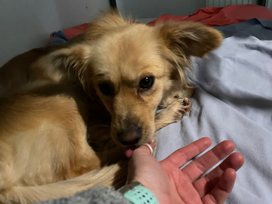 Zum Glück wurde Grig informiert und konnte Malou rechtzeitig zu uns ins Shelter bringen. Hier ist sie nun seit dem 08. November 2025 in Sicherheit. Sobald ihre Läufigkeit vorbei ist, wird sie kastriert, um ihr weiteres Leid zu ersparen.