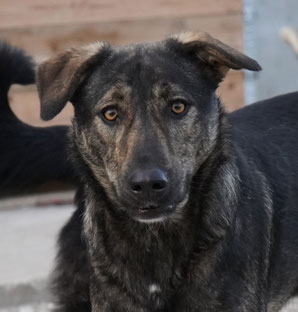 Mirja is a young, reserved female who has not yet experienced much in her life. She is insecure towards strangers and keeps her distance. When approached calmly, she backs away and runs to a more distant corner. Basically, she orients herself strongly to the other dogs and sometimes comes closer to one in the protection of her group. With other dogs she shows herself generally social and compatible.