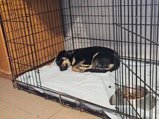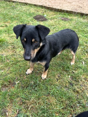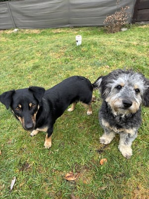 She is a timid dog, and it will continue to take patience, time, and training. In particular, putting on her collar and harness still needs practice. Currently, Lotti can only go outside in the garden – but there she moves around confidently, runs happily with the other dog, shows no fear, even walks easily over tarpaulins, and isn't bothered by the vacuum cleaner.