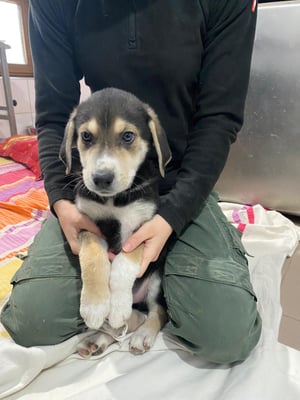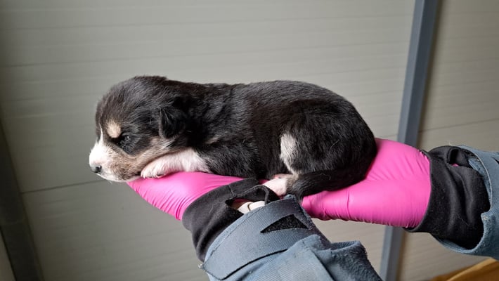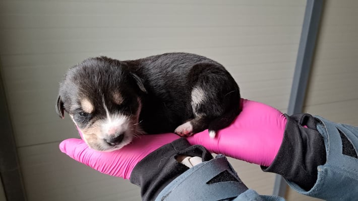 Ole came to us on November 8, 2025, along with his nine siblings and his brave mother, Alice B. The dog family was born in a company yard – ten tiny puppies, unprotected on the cold ground, without shelter or security. The employees told us that the mother and her puppies couldn't stay there. They had to be moved immediately.