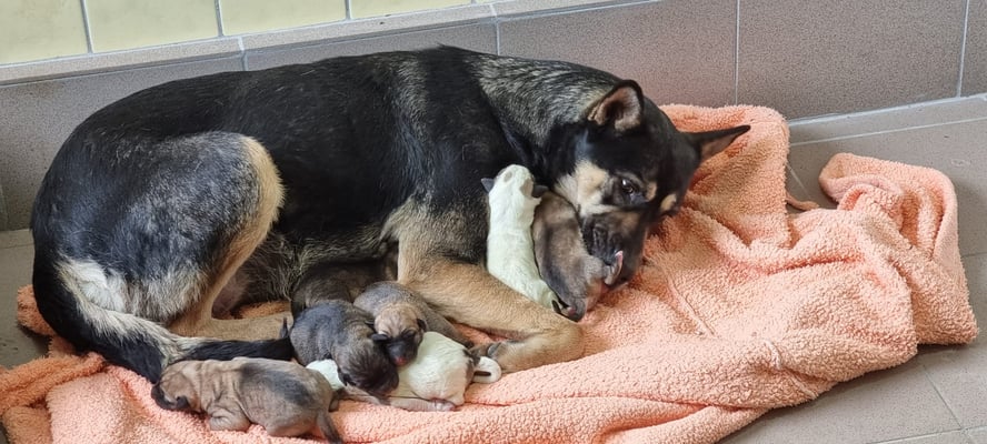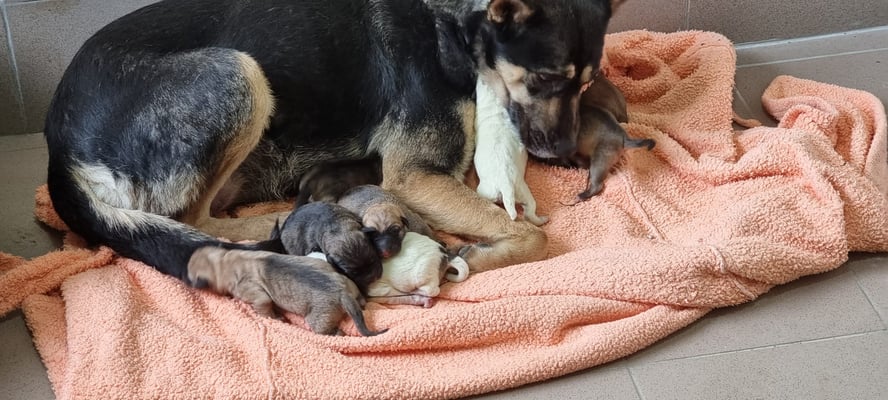 Sutton came to us with his mum Sana and his siblings Ilara, Marielle, Billie, Thekla, Ulrich, Ossy and Benno. Mum Sana had had her puppies in a yard near the ring road and someone called Grig, so they came to us.