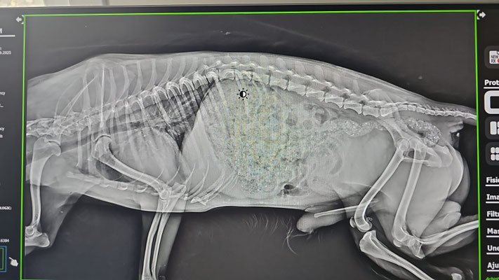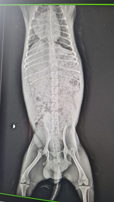 Seine Geschichte beginnt bereits früher: Am 10.09.2025 wurde Tache von einer Tierschützerin schwer verletzt aufgefunden, nachdem er angefahren worden war. Die anschließende radiologische Untersuchung zeigte eine Verschiebung der Wirbelsäule im Brustbereich (T12). Seitdem ist Tache an den Hinterbeinen gelähmt.
