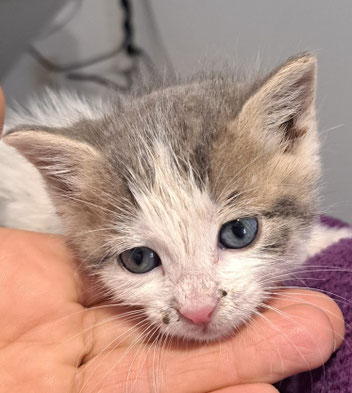 Cloony kam im September 2025 zu uns. Ein Arbeiter von uns fand den kleinen Kater auf der DN7, direkt auf dem Weg zum Kreisverkehr – ganz allein und hilflos am Straßenrand.