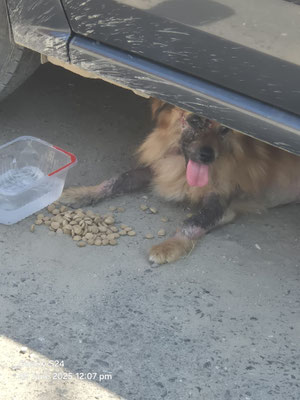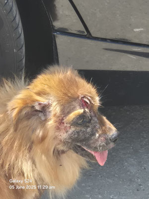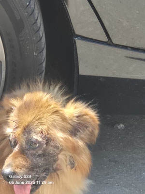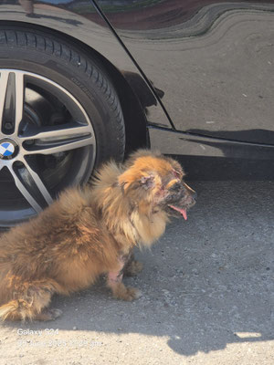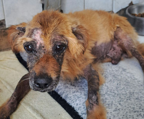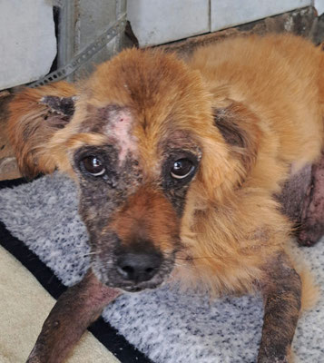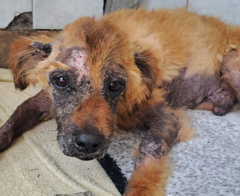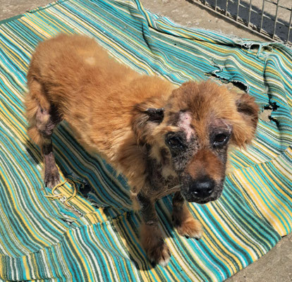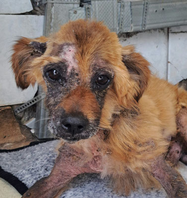 Okay, wenn man sich angesehen hat, wie er auf menschlichen Kontakt reagierte, ist es sicherlich kein Verlust für den armen Kerl... Aber wie kann man sich seiner Verantwortung einfach so rücksichtslos entledigen? Einen armen, wehrlosen Hund erst so verwahrlosen zu lassen und ihn dann einfach zum Sterben auf die Straße zu werfen?? Wirklich einfach unglaublich… Der kleine Mann sah echt mitleiderregend aus, als er zu uns kam... Seine Haut und sein Fell waren voller Parasiten, an manchen Stellen hatte er sich schon blutig gekratzt.